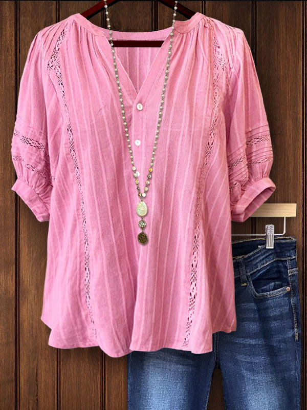 Upgrade your wardrobe with this pink lace patchwork shirt. Delicate lace details and pink accents add an air of elegance and sophistication to any outfit. With a relaxed fit, puff sleeves, button fly, and V-neck, this is a comfortable and beautiful piece that'll look great on anyone.