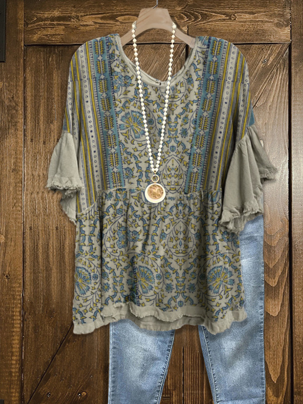 If you want to keep things trendy and retro, opt for our ruffled frayed top. The retro military green tone printed patchwork design, wide ruffle sleeves, and loose fit add a touch of unique style. Can be paired with casual denim shorts or trousers for everyday use.