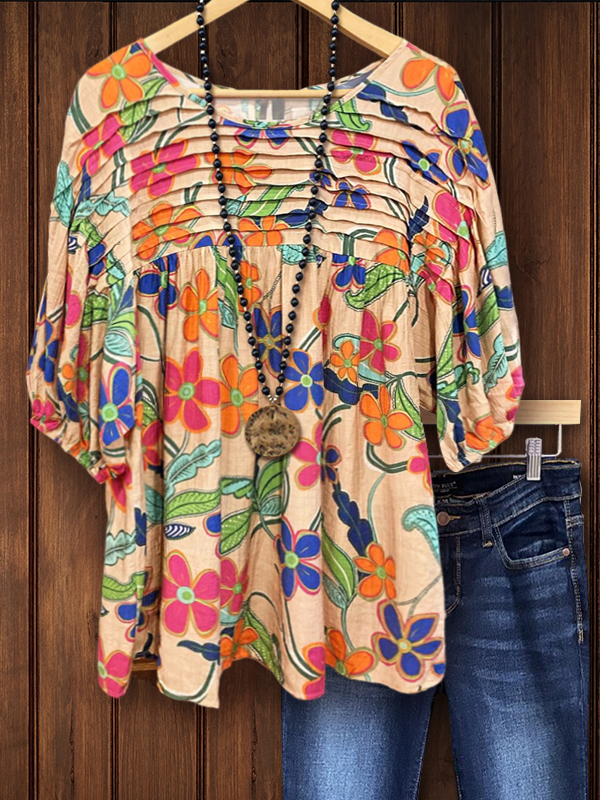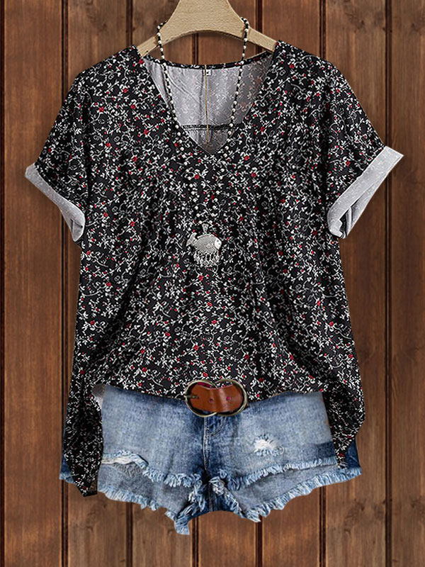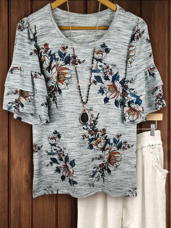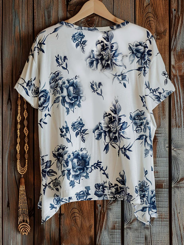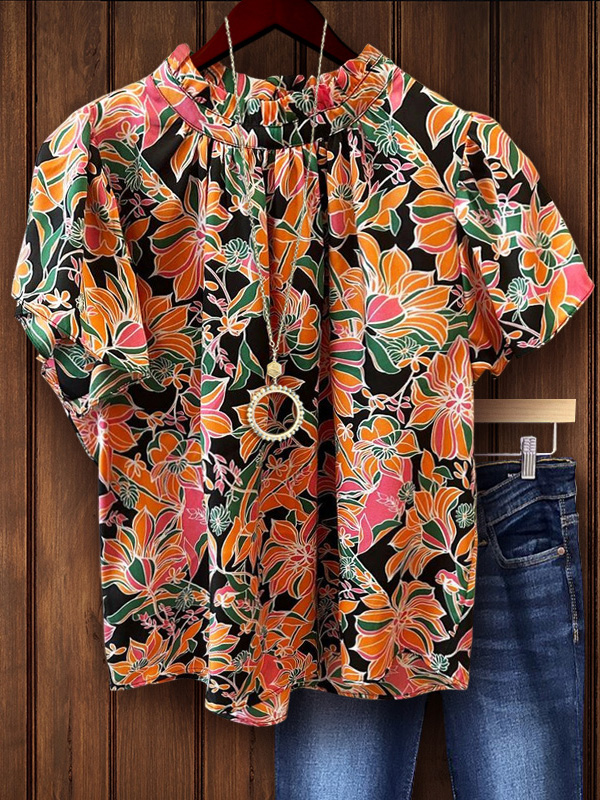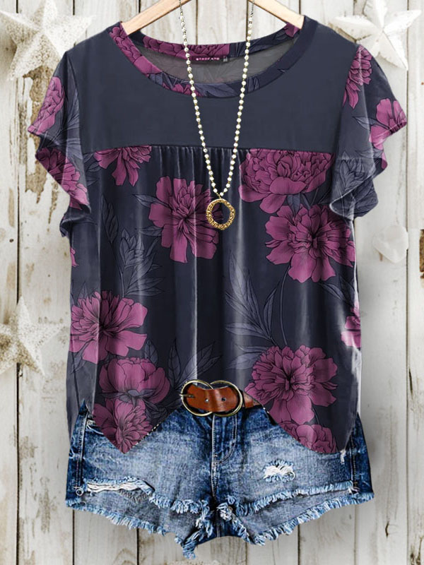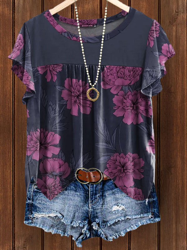 Loose Floral Printed Round Neck Cap Sleeve Blouse