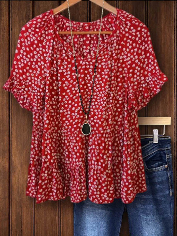 Red Floral Short Sleeve Tiered Blouse